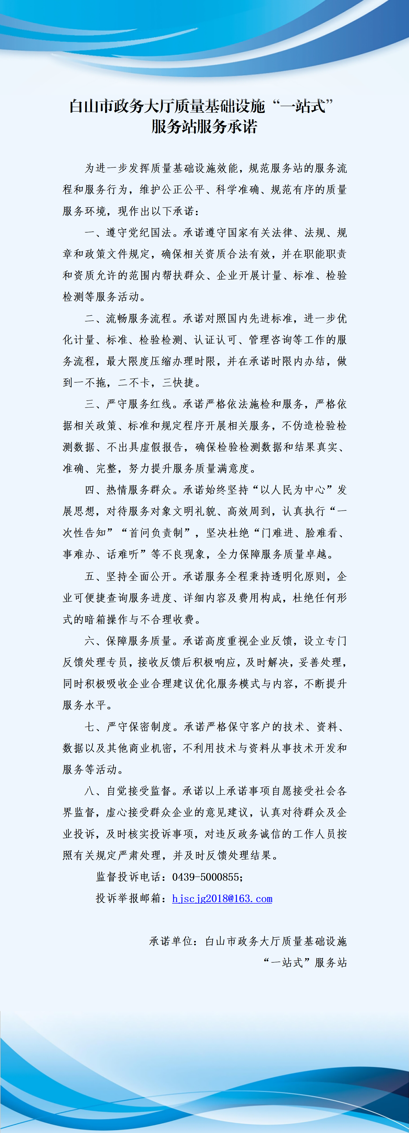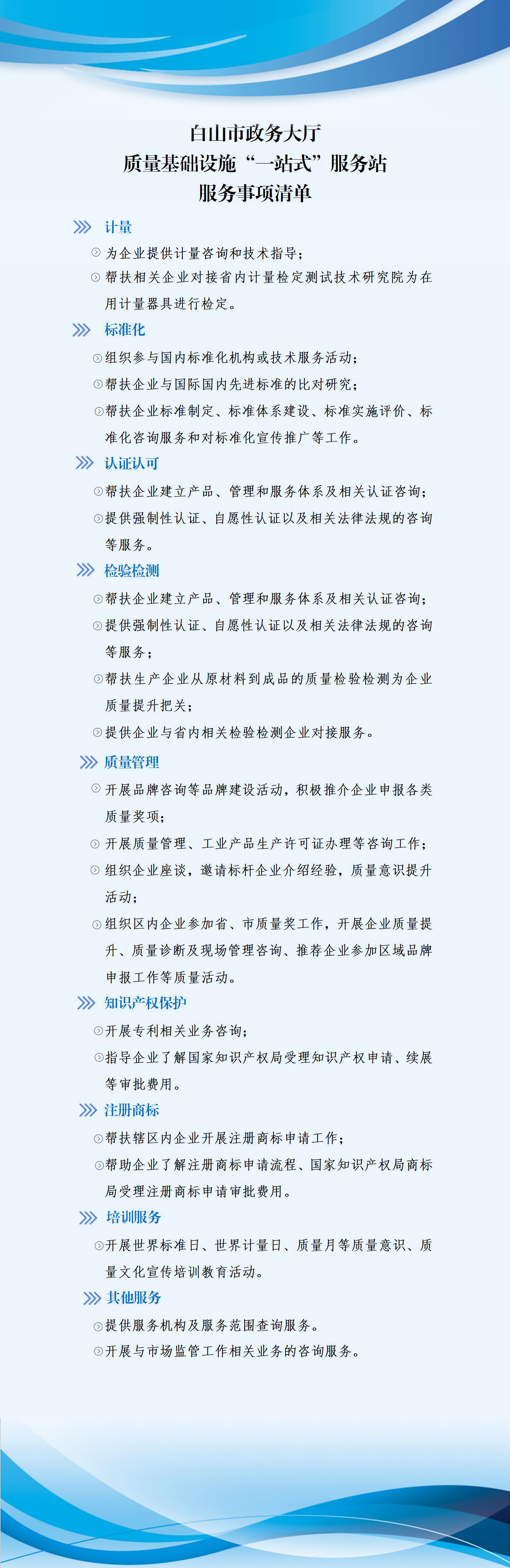 白山市政务服务中心服务站,紧密依托白山市政务服务中心的资源优势,高效统筹市场监管业务职能,聚焦白山市辖区企业与群众的实际需求,以提供全链条、全方位、全过程的质量基础设施综合服务为目标,全面提供质量管理、检验检测、知识产权、标准化、计量、认证等多领域专业服务,为客户“一站式”解决企业的质量基础设施服务需求。