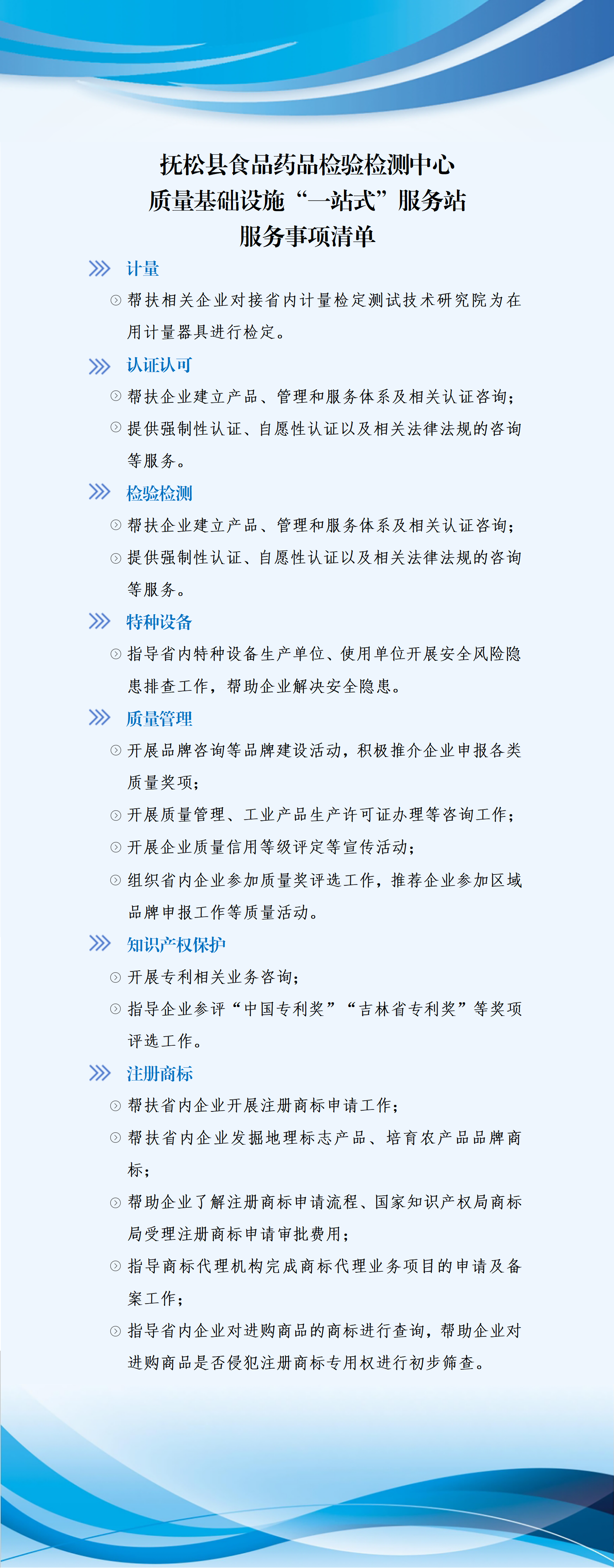 服务范围:具备食品、生活饮用水、人参(地方特色产品)三大类产品的综合检测能力,可开展涵盖感官、理化、微生物、农药残留等130项检测参数。依法承担抚松县区域内涉及安全防护、医疗卫生、环境监测、贸易结算四大民生重点领域的强制检定计量器具的检定工作,主要检定项目包括:压力表(如锅炉、压力容器等设备用表)、血压计、燃油加油机、电子秤(各类电子计价秤、台案秤等)、水表和出租车计价器。