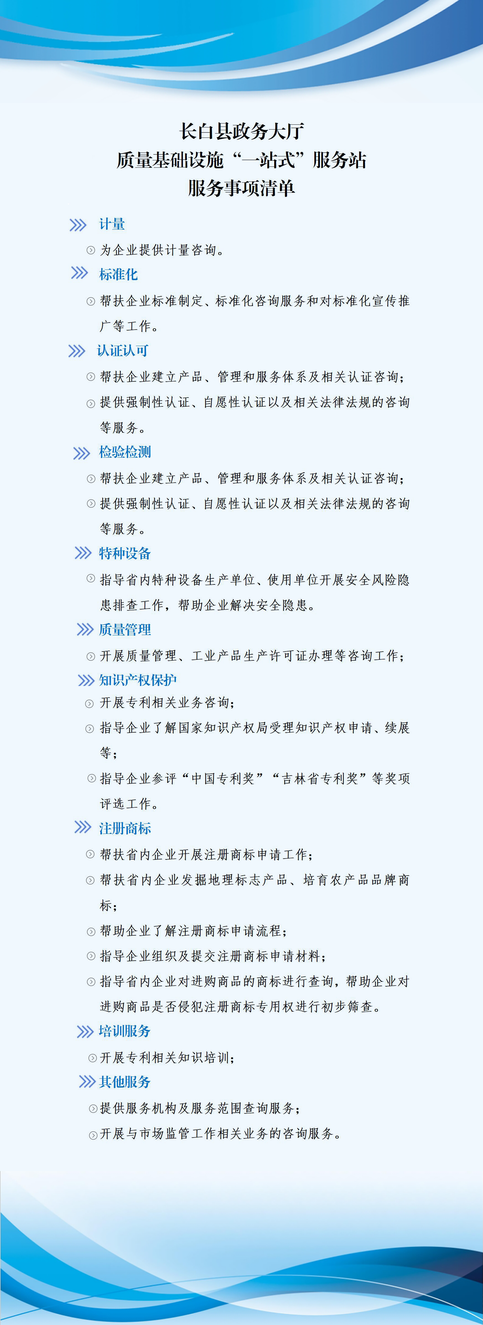 服务范围:开展质量管理、工业产品生产许可证办理等咨询工作。帮扶企业标准制定、标准化咨询服务和对标准化宣传推广等工作。为企业提供计量咨询。帮扶企业建立产品、管理和服务体系及相关认证咨询;提供强制性认证、自愿性认证以及相关法律法规的咨询等服务。开展专利相关业务咨询和技术服务;指导企业了解国家知识产权局受理知识产权申请、续展等;指导企业参评“中国专利奖”“吉林省专利奖”等奖项评选工作。帮扶县内企业开展注册商标申请工作;帮扶县内企业发掘地理标志产品、培育农产品品牌商标;帮助企业了解注册商标申请流程;指导企业组织及提交注册商标申请材料;指导县内企业对进购商品的商标进行查询,帮助企业对进购商品是否侵犯注册商标专用权进行初步筛查。指导县内特种设备生产单位、使用单位开展安全风险隐患排查工作,帮助企业解决安全隐患。提供服务机构及服务范围查询服务;开展与市场监管工作相关业务的咨询等服务。