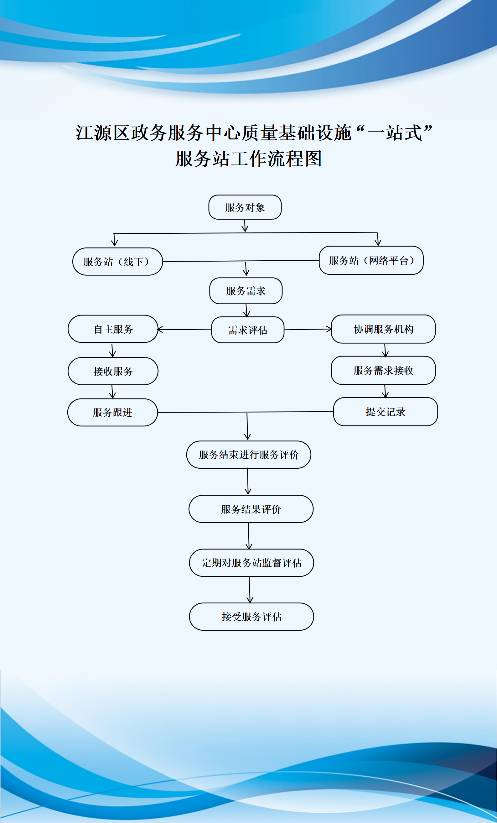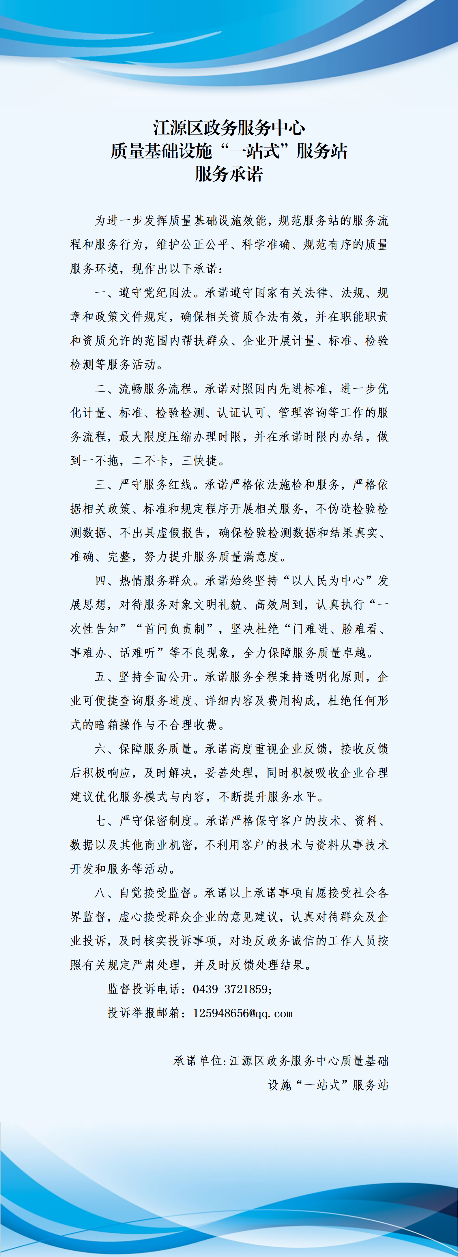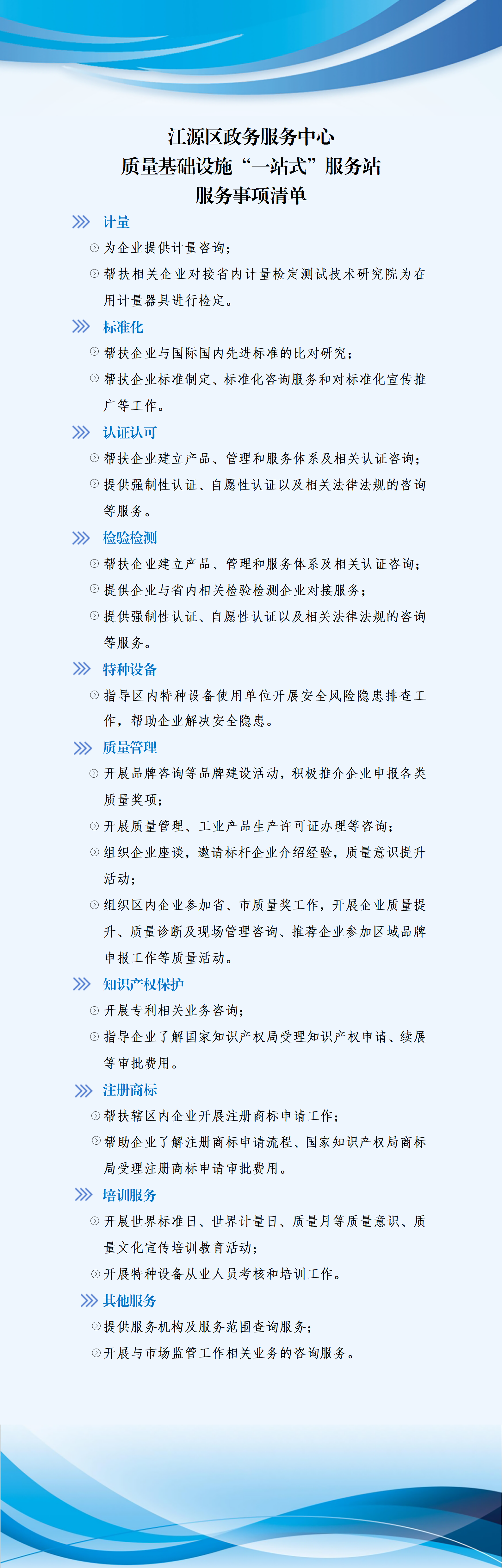 江源区政务服务中心服务站,为进一步打通企业、机构、监管、市场全生态质量服务场景和信息传递,实现区域内各项质量技术服务的“一站式”查询、办理、服务,融合了计量、标准、认证认可、检验检测、质量管理等要素资源,以知识产权、品牌培育、质量培训等为延伸,面向企业、产业、区域、特别是中小企业提供全链条、全方位、全过程的质量基础设施综合服务站。